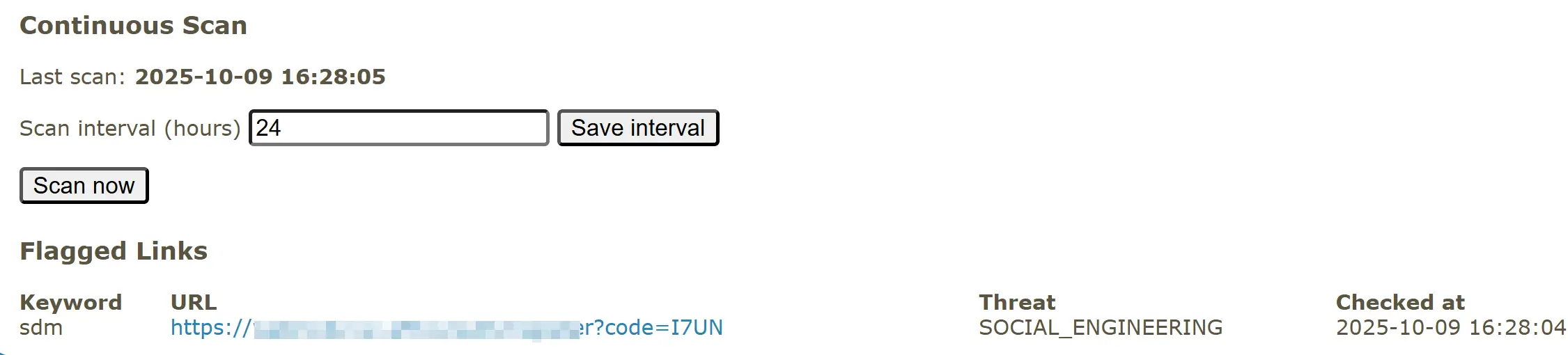 - 命中列表展示:在“Flagged Links”表格中展示被标记的短链(关键词、原始 URL、威胁类型、最近检查时间)。